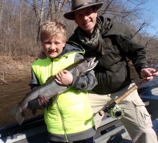Here’s 9-year-old CJ with Dad celebrating in style with his first ever steelhead. A 29″ Muskegon River silver bullet taken with a fly rod! If you could have only seen the cast CJ made to hook this fish! Not to mention the fight. CJ handled it flawlessly navigating this outstanding chrome hen out of several logjams. I believe we have a new “Man of Steel” among us my friends. Outstanding job CJ! Welcome to the steelhead club!