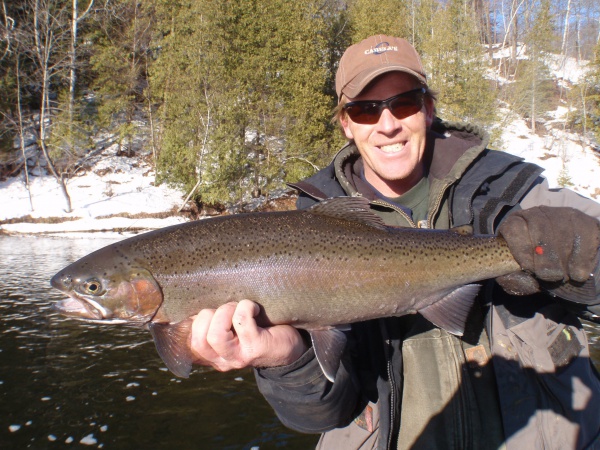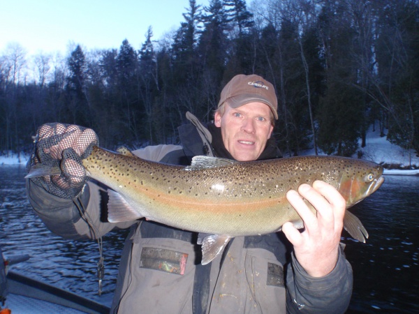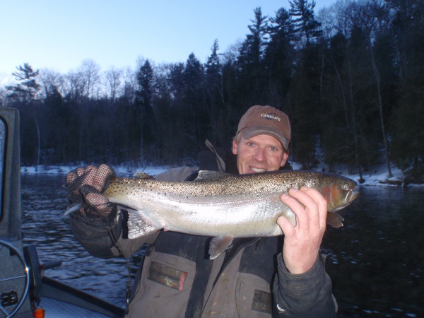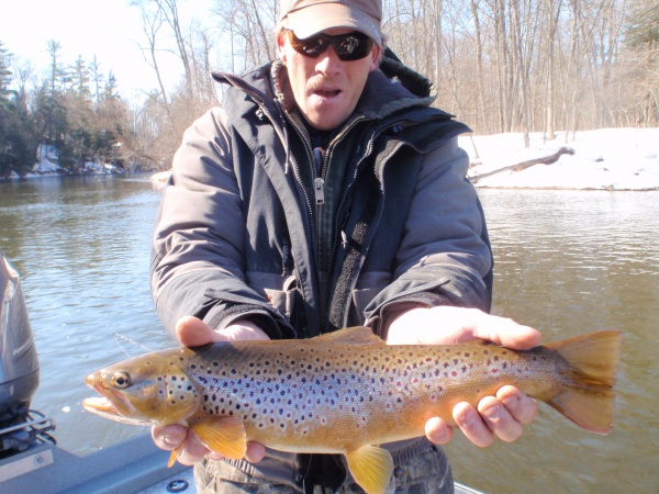 Over the past 17+ years exclusively fishing the Muskegon river, one thing keeps me coming back and that’s the wide diversity of fish the river system has to offer. Here’s Jeff with some of those great fish. Nice chrome steelhead, fat Muskegon river rainbow trout (not pictured) and an awesome 20″ Muskegon river brown trout. From what I’ve seen with the size, quantity, and quality of trout my clients caught this winter, trout fishing on the Muskegon will be excellent late spring into early summer! Five weight rods & dry flies are ready for anyone who’d like to book a morning or evening trout trip with us. If you’ve never experienced stalking large size trout rising for the hatch, casting, and watching the water explode when they slam your dry fly top surface on very light fly rods you’ve got to give us a try! It’s a very exciting experience.