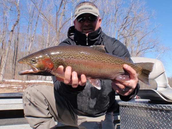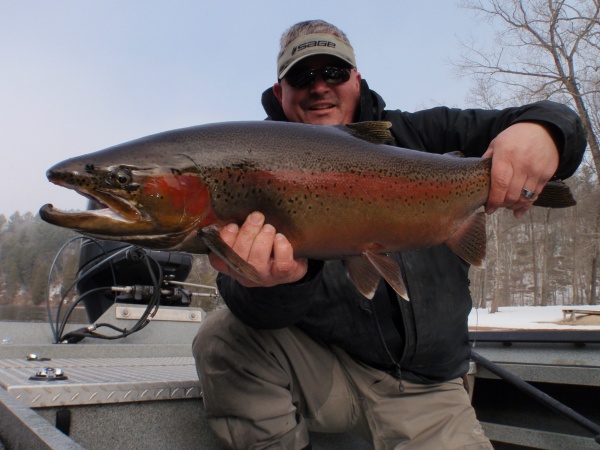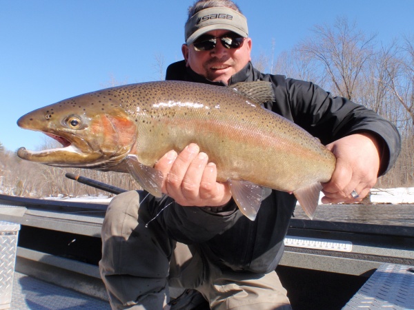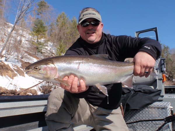 The stage is being set. Well needed warm weather patterns the rest of the week will help kick start the Muskegon river offering the possibility of an excellent spring steelhead run. Evidence provided by the beautiful chrome hen pictured above. Look for this week’s run-off to trigger a major push of steelhead by weeks end. Follow the water temps. 35-degree water temps now with rising temps thru the week. All of which makes this early April look like a very strong possibility for the start of the peak steelhead run.