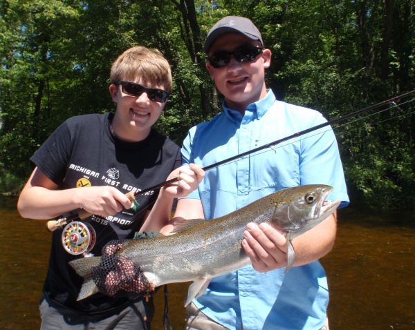 Tommy (in blue) with a chrome steelhead caught June 20th on Muskegon river