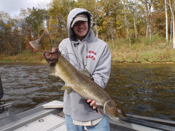 Neil pictured top with a nice Muskegon river salmon and really nice 20″ rainbow trout along with his son Derrick with a nice salmon from the Muskegon river on a beautiful fall day.