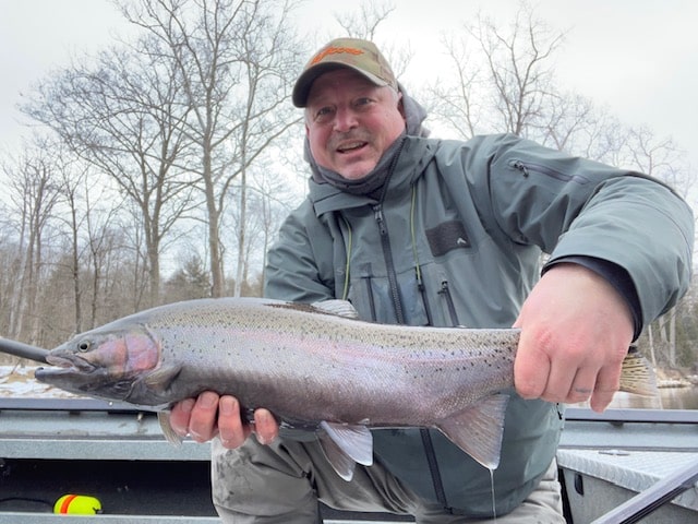 Here’s a very healthy big beautiful Muskegon river steelhead seeking refuge from Lake Michigans’ harsh winter environment spending time in the security of the Muskegon river winter lies waiting for that spring thaw.