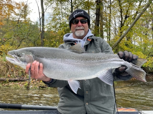 Here’s Ed from Hillsdale, MI with an absolute wall-hanger. 19 pounds and just shy of 33-inches of chromed out Muskegon river steelhead! Absolutely amazing fight! Was a miracle just to get in the boat. This steelhead hit and went immediately upstream sending Ed into his backing. Circled the boat four times and at the last second got to turn his head into the net! Incredible steelhead Ed! Congrats! This is one fall steelhead I won’t forget anytime soon! Beautiful steelhead!!
