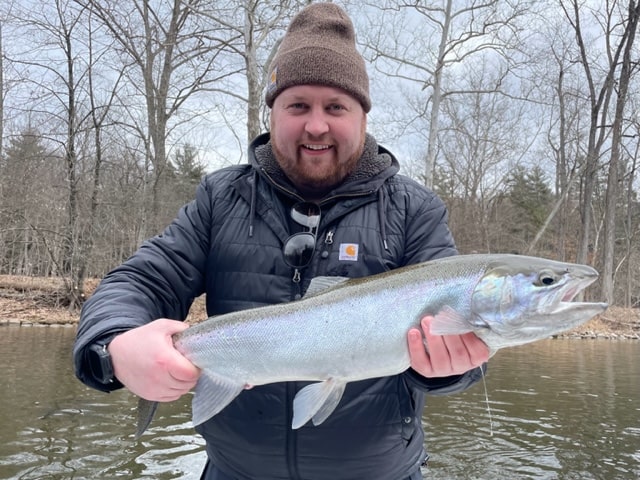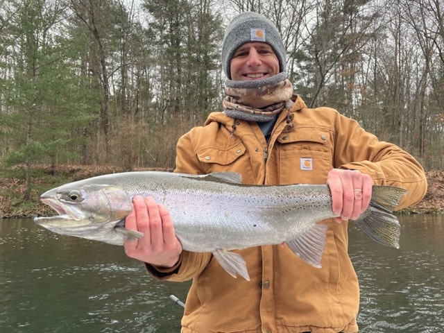Jimmy with another beautiful chromed out steelhead from the Muskegon river.